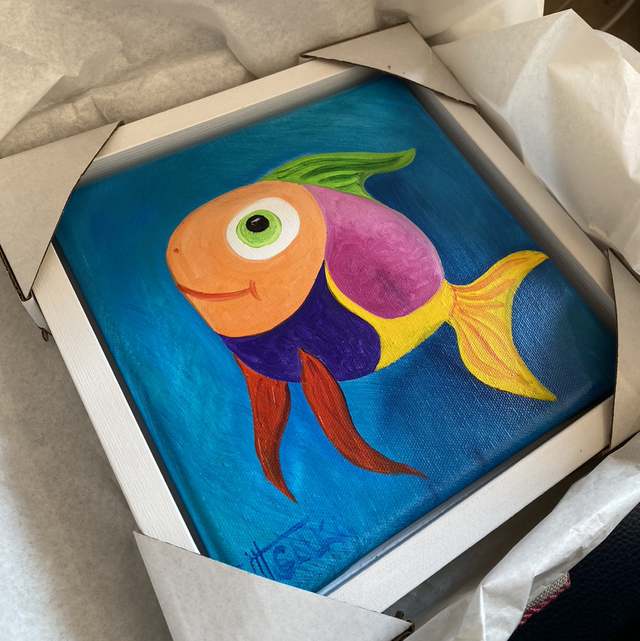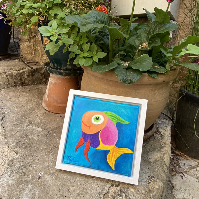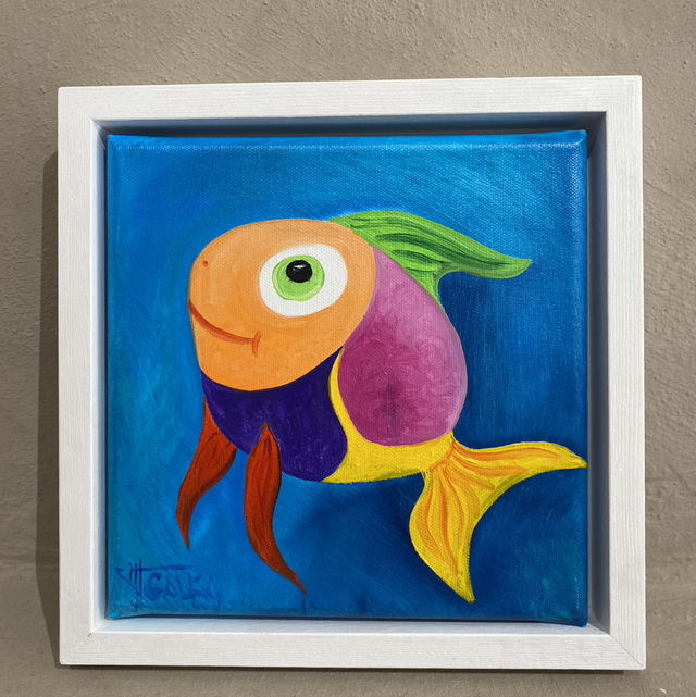Petit poisson porte-bonheur tout en couleur. A offrir ou s’offrir. Huile sur toile de Galka. Pièce unique 20x20cm. Cadre blanc, caisse américaine 24x24cm. Prêt à accrocher.