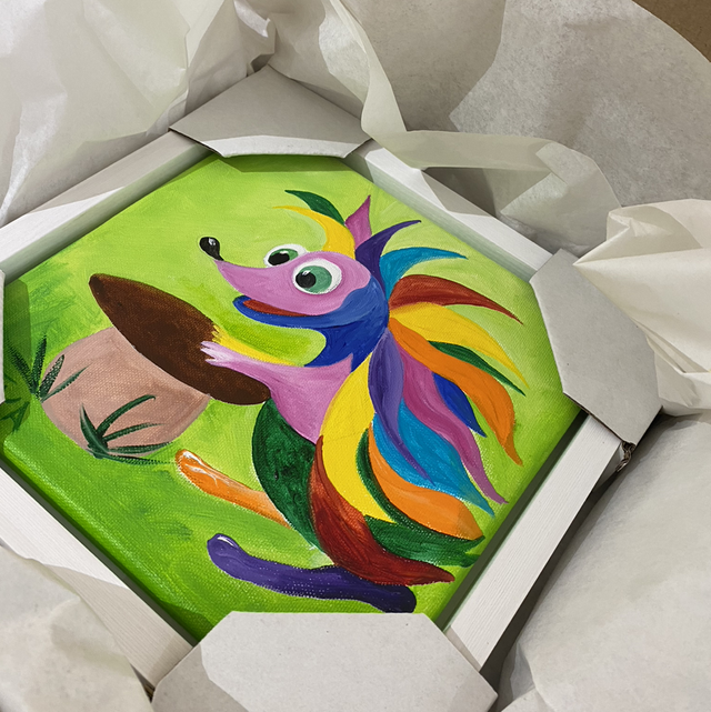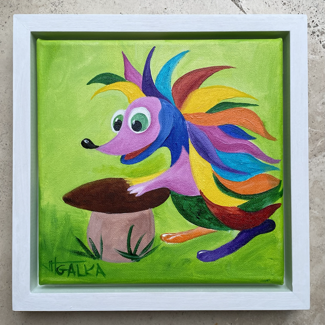 Hérisson et son champignon. Petit format 20x20cm, cadre blanc (caisse américaine) 24x24cm. Huile sur toile. Pièce unique. Prêt à accrocher.